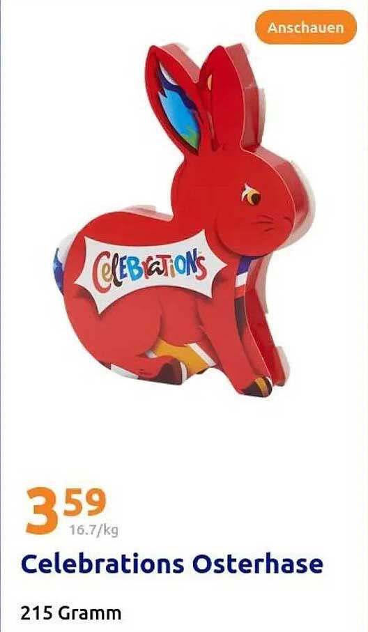 Sehen Sie sich das Celebrations Osterhase Angebot bei Action an! Dieses fantastische Angebot ist jetzt im neuesten Action Prospekt verfügbar. Nutzen Sie diese Chance und sparen Sie viel bei Ihrem Einkauf.