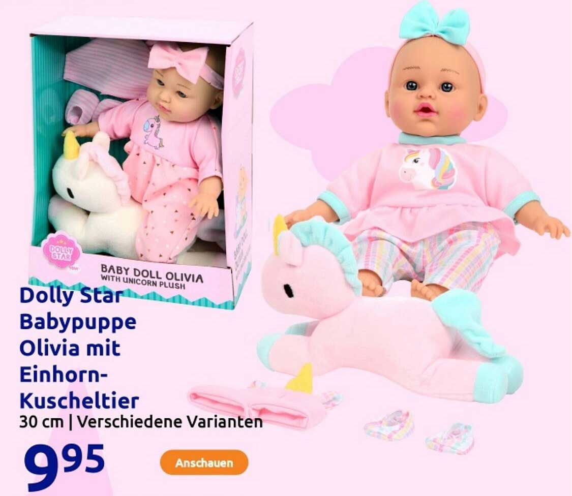 Sehen Sie sich jetzt das Dolly Star Babypuppe Olivia mit Einhorn-Kuscheltiers 30 cm Angebot im Action Prospekt an. Dieses Angebot ist gültig von 08.10.2025 bis 14.10.2025.