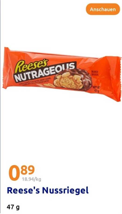 Sehen Sie sich das Reese's Nussriegel Angebot bei Action an! Dieses fantastische Angebot ist jetzt im neuesten Action Prospekt verfügbar. Nutzen Sie diese Chance und sparen Sie viel bei Ihrem Einkauf.