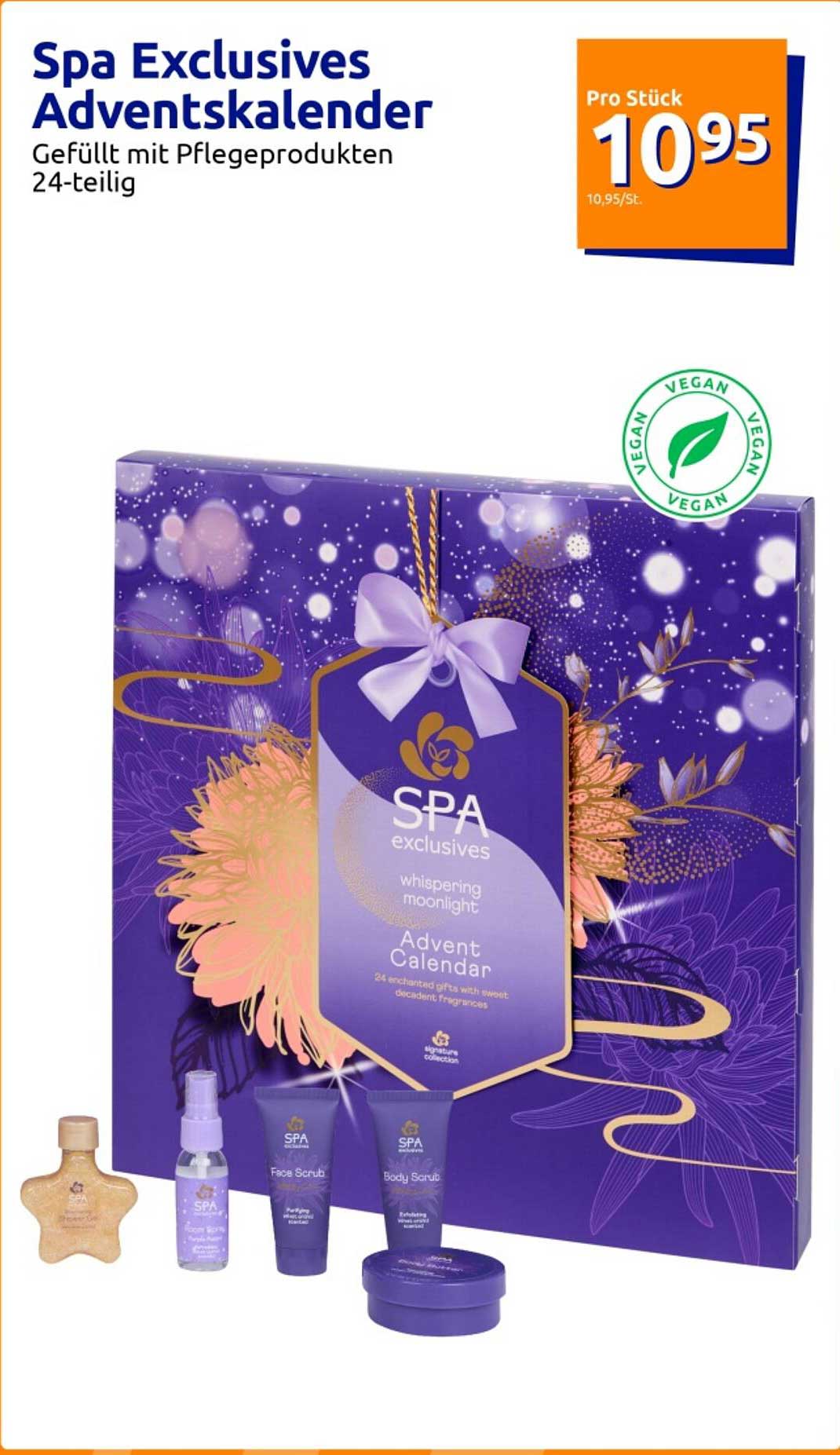 Sehen Sie sich jetzt das Spa Exclusives Adventskalender Angebot im Action Prospekt an. Dieses Angebot ist gültig von 09.10.2024 bis 15.10.2024.