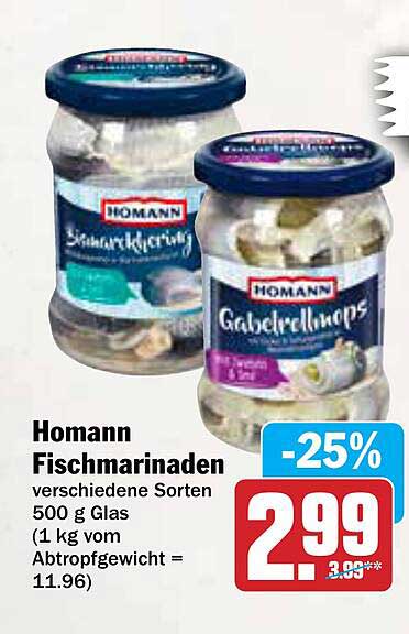 Sehen Sie sich jetzt das Homann Fischmarinaden verschiedene Sorten 500 g Glas Angebot im AEZ Prospekt an. Dieses Angebot ist gültig von 07.04.2025 bis 12.04.2025.
