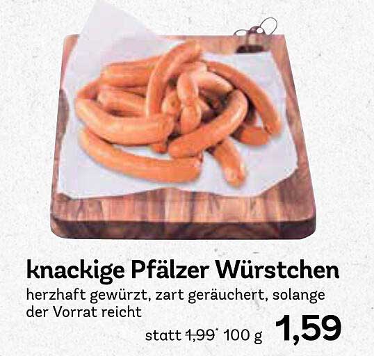 Der Vergleichspreis für die knackigen Pfälzer Würstchen liegt bei 1,99 € pro 100 g. Jetzt erhalten Sie die Würstchen zum Aktionspreis von nur 1,59 €. Das bedeutet eine Ersparnis von 20 Cent pro 100 g. Nutzen Sie diese Gelegenheit, um Ihre Geschmacksknospen zu verwöhnen und dabei Geld zu sparen!