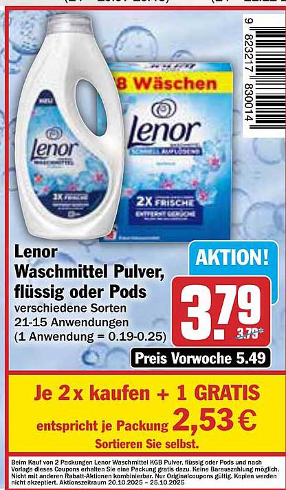 Entdecken Sie das exklusive Angebot von Lenor Waschmittel, das in der Zeit vom 20. bis 25. Oktober 2025 erhältlich ist. Lenor bietet eine Vielzahl an Waschmittelvarianten, darunter Pulvern, Flüssigkeiten und Pods, die speziell entwickelt wurden, um Ihre Wäsche frisch und sauber zu halten. Diese Aktion sorgt dafür, dass Sie hochwertige Produkte zu einem unschlagbaren Preis genießen können.