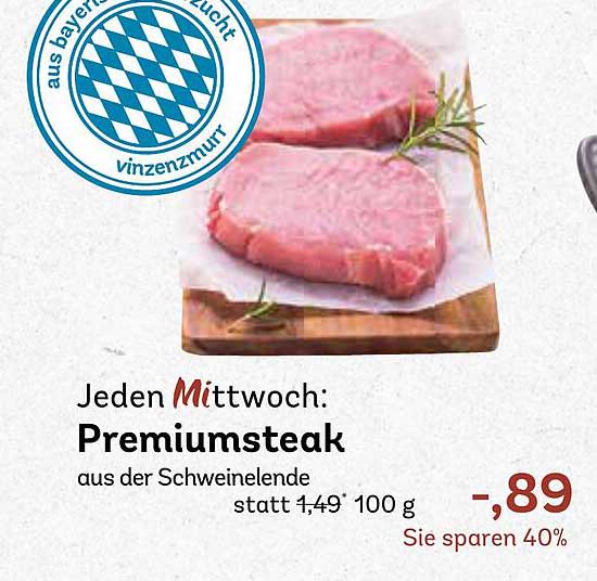 Der reguläre Preis für dieses Premiumsteak liegt bei 1,49 EUR pro 100 g, was bedeutet, dass Sie bei diesem Angebot satte 40 % sparen! Ein unschlagbarer Preis für ein Produkt, das oft in der gehobenen Gastronomie zu finden ist. Nutzen Sie die Chance, das Premiumsteak zu einem besonders günstigen Preis zu genießen und beeindrucken Sie Ihre Gäste mit einem erstklassigen Gericht.