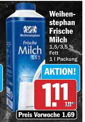 Sehen Sie sich jetzt das Weihenstephan Frische Milch 1,5/3,5 % Fett 1 l Packung Angebot im AEZ Prospekt an. Dieses Angebot ist gültig von 20.10.2025 bis 25.10.2025.