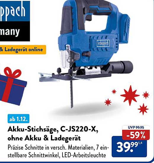 Sehen Sie sich jetzt das Akku-Stichsäge, C-JS220-X, ohne Akku & Ladegerät Angebot im Aldi Nord Prospekt an. Dieses Angebot ist gültig von 02.12.2024 bis 07.12.2024.