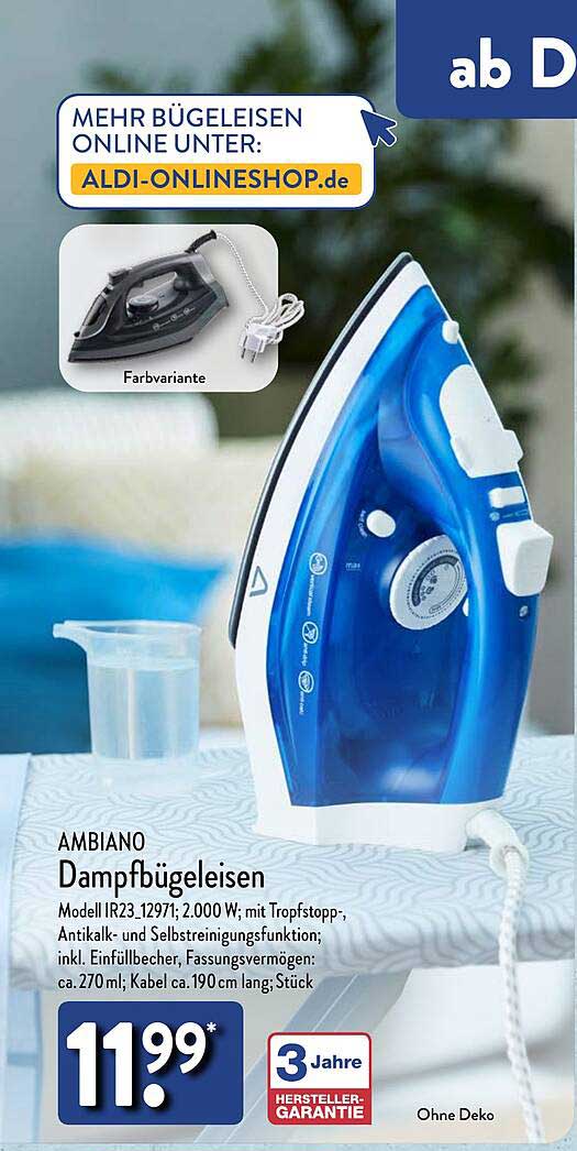 Entdecken Sie das großartige Ambiano Dampfbügeleisen Angebot im neuesten Aldi Nord Prospekt. Neben diesem Angebot finden Sie noch viele weitere attraktive Rabatte. Sie können das Ambiano Dampfbügeleisen einfach online über die Aldi Nord Website bestellen oder in einem Geschäft in Ihrer Nähe kaufen.