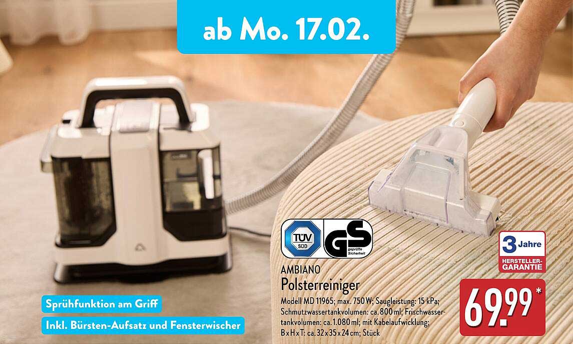 Sehen Sie sich jetzt das AMBIANO Polsterreiniger Angebot im Aldi Nord Prospekt an. Dieses Angebot ist gültig von 17.02.2025 bis 22.02.2025.