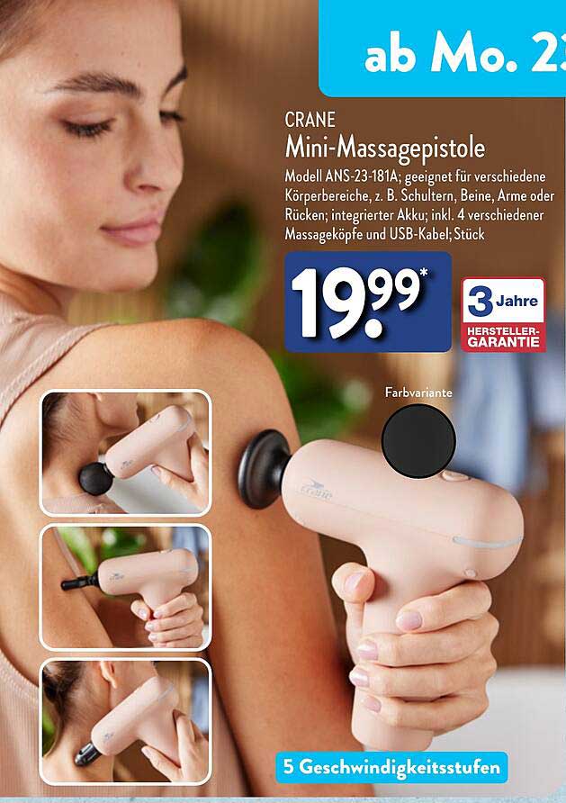 Sehen Sie sich das Crane Mini-Massagepistole Angebot bei Aldi Nord an! Dieses fantastische Angebot ist jetzt im neuesten Aldi Nord Prospekt verfügbar. Nutzen Sie diese Chance und sparen Sie viel bei Ihrem Einkauf.