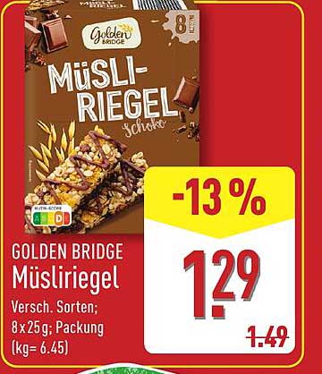 Aktuell sind die GOLDEN BRIDGE Müsliriegel zum Preis von nur 1,29 Euro erhältlich, was eine Ersparnis von 0,20 Euro im Vergleich zum regulären Preis von 1,49 Euro bedeutet. Diese 13%ige Ersparnis macht das Angebot besonders attraktiv und gibt Ihnen die Möglichkeit, diese gesunden Snacks zu einem unschlagbaren Preis zu genießen.