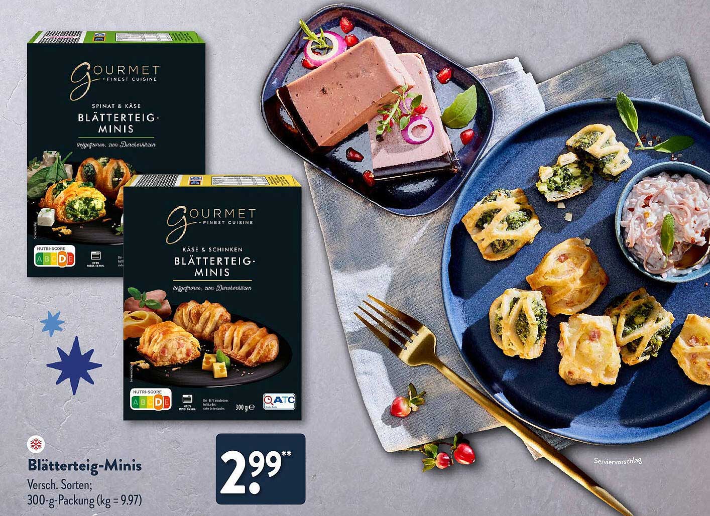 Sehen Sie sich jetzt das Gourmet Käse & Schinken Blätterteig-Minís Angebot im Aldi Nord Prospekt an. Dieses Angebot ist gültig von 27.10.2024 bis 28.12.2024.