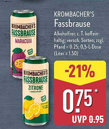 Sehen Sie sich das Krombacher's Fassbrause Angebot bei Aldi Nord an! Dieses fantastische Angebot ist jetzt im neuesten Aldi Nord Prospekt verfügbar. Nutzen Sie diese Chance und sparen Sie viel bei Ihrem Einkauf.
