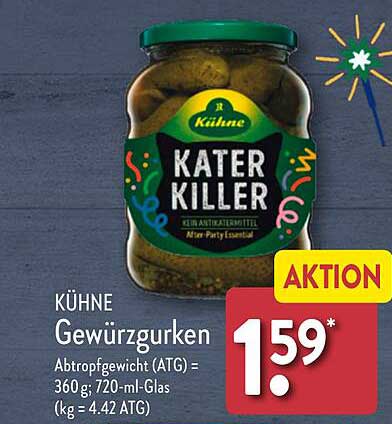 Sehen Sie sich jetzt das KÜHNE KATER KILLER Gewürzgurken Angebot im Aldi Nord Prospekt an. Dieses Angebot ist gültig von 23.12.2024 bis 28.12.2024.