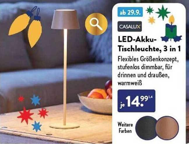 Möchten Sie sofort informiert werden, sobald das Led-Akku-Tischleuchte, 3 In 1 im Angebot ist? Melden Sie sich für unsere Angebots-Benachrichtigungen an. So erhalten Sie eine Benachrichtigung, sobald das Produkt zu einem günstigen Preis verfügbar ist.