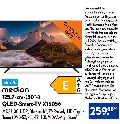 Sehen Sie sich jetzt das medion 125,7-cm-(50-)-QLED-Smart-TV X15056 Angebot im Aldi Nord Prospekt an. Dieses Angebot ist gültig von 08.09.2025 bis 13.09.2025.