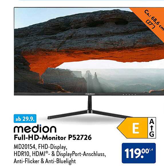 Entdecken Sie das großartige Medion Full-Hd-Monitor P52726 Angebot im neuesten Aldi Nord Prospekt. Neben diesem Angebot finden Sie noch viele weitere attraktive Rabatte. Sie können das Medion Full-Hd-Monitor P52726 einfach online über die Aldi Nord Website bestellen oder in einem Geschäft in Ihrer Nähe kaufen.