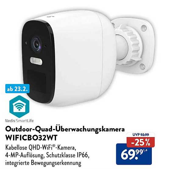 Sehen Sie sich jetzt das Outdoor-Quad-Überwachungskamera WIFICB032WT Angebot im Aldi Nord Prospekt an. Dieses Angebot ist gültig von 24.02.2025 bis 01.03.2025.