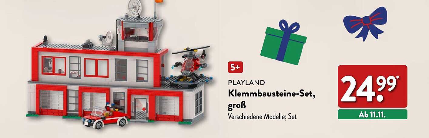 Sehen Sie sich jetzt das PLAYLAND Klemmbausteine-Set, groß Angebot im Aldi Nord Prospekt an. Dieses Angebot ist gültig von 21.10.2024 bis 16.12.2024.