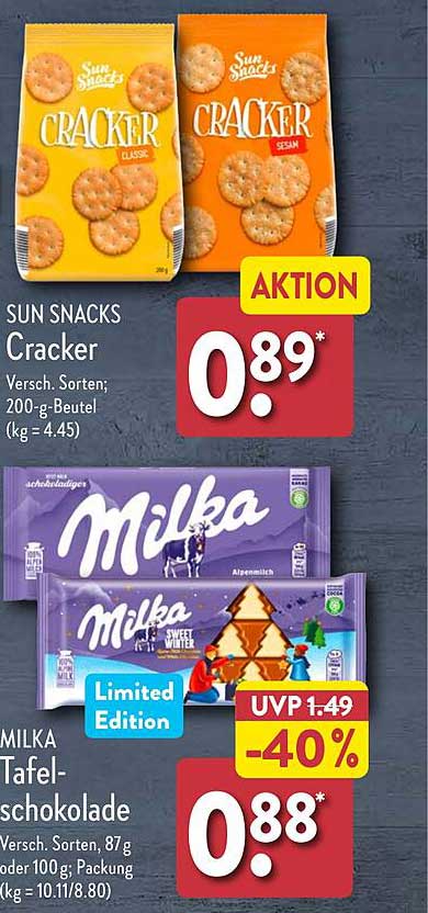 Sun Snacks Cracker Milka Tafelschokolade Angebot bei Aldi Nord