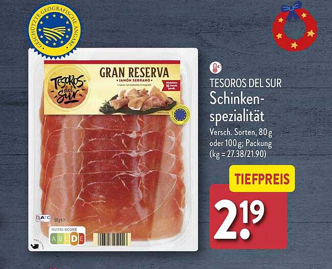 Sehen Sie sich jetzt das TESOROS DEL SUR Schinken-spezialität Angebot im Aldi Nord Prospekt an. Dieses Angebot ist gültig von 16.12.2024 bis 21.12.2024.