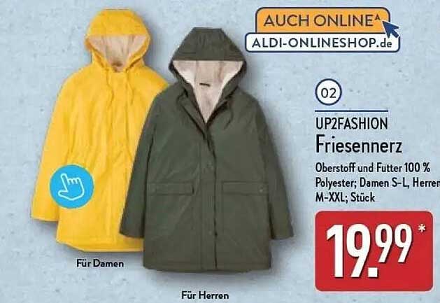 Entdecken Sie das großartige Up2Fashion Friesennerz Angebot im neuesten Aldi Nord Prospekt. Neben diesem Angebot finden Sie noch viele weitere attraktive Rabatte. Sie können das Up2Fashion Friesennerz einfach online über die Aldi Nord Website bestellen oder in einem Geschäft in Ihrer Nähe kaufen.