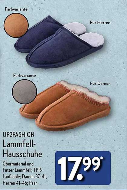 Sehen Sie sich das Up2Fashion Lammfell-Hausschuhe Angebot bei Aldi Nord an! Dieses fantastische Angebot ist jetzt im neuesten Aldi Nord Prospekt verfügbar. Nutzen Sie diese Chance und sparen Sie viel bei Ihrem Einkauf.