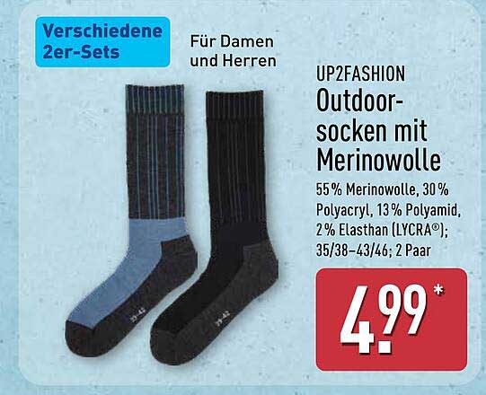 Sehen Sie sich jetzt das UP2FASHION Outdoorsocken mit Merinowolle (2 Paar) Angebot im Aldi Nord Prospekt an. Dieses Angebot ist gültig von 20.10.2025 bis 26.10.2025.