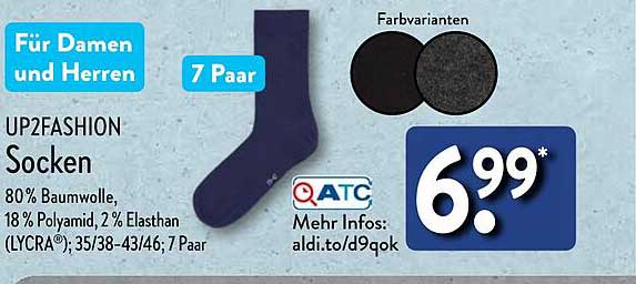 Sehen Sie sich das Up2Fashion Socken Angebot bei Aldi Nord an! Dieses fantastische Angebot ist jetzt im neuesten Aldi Nord Prospekt verfügbar. Nutzen Sie diese Chance und sparen Sie viel bei Ihrem Einkauf.