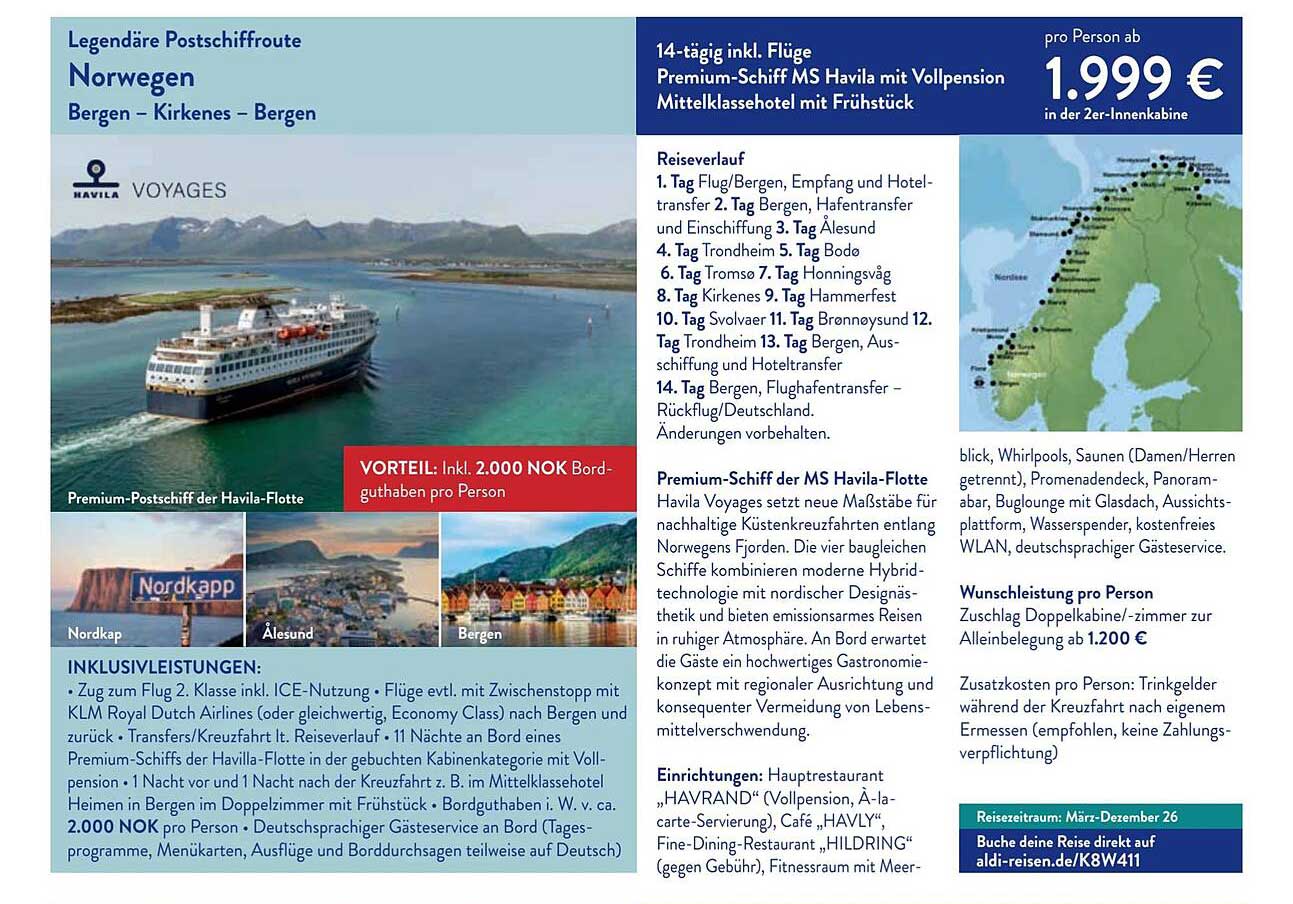 Sehen Sie sich jetzt das Legendäre Postschifffahrt Norwegen - Bergen, Kirkenes, Bergen Angebot im Aldi Süd Reisen Prospekt an. Dieses Angebot ist gültig von 03.11.2025 bis 01.12.2025.