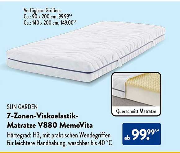 Entspannen Sie sich auf der neuen 7-Zonen-Viskoelastik-Matratze V880 MemoVita von SUN GARDEN. Diese Matratze bietet Unterstützung und Comfort für einen erholsamen Schlaf. Vom 7. bis 13. April 2025 finden Sie dieses attraktive Angebot, das sich ideal für alle Schlafgewohnheiten eignet.