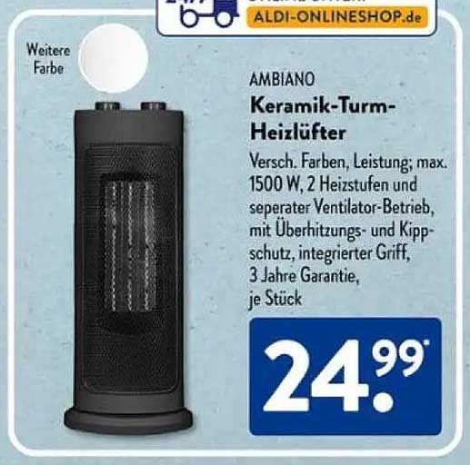 Sehen Sie sich das Ambiano Keramik-Turm-Heizlüfter Angebot bei Aldi Süd an! Dieses fantastische Angebot ist jetzt im neuesten Aldi Süd Prospekt verfügbar. Nutzen Sie diese Chance und sparen Sie viel bei Ihrem Einkauf.