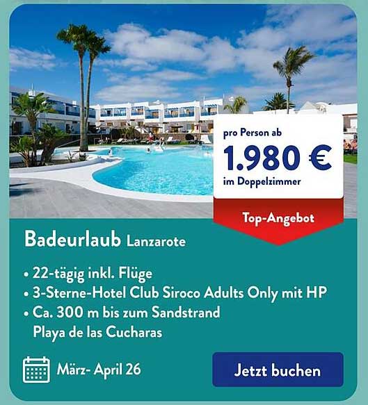 Sehen Sie sich jetzt das Badeurlaub Lanzarote - 22-tägiger Aufenthalt im Club Siroco Adults Only Angebot im Aldi Süd Prospekt an. Dieses Angebot ist gültig von 13.10.2025 bis 19.10.2025.