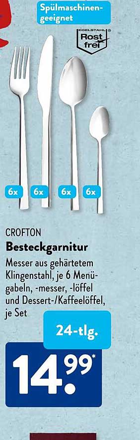 Entdecken Sie das großartige Crofton Besteckgarnitur Angebot im neuesten Aldi Süd Prospekt. Neben diesem Angebot finden Sie noch viele weitere attraktive Rabatte. Sie können das Crofton Besteckgarnitur einfach online über die Aldi Süd Website bestellen oder in einem Geschäft in Ihrer Nähe kaufen.