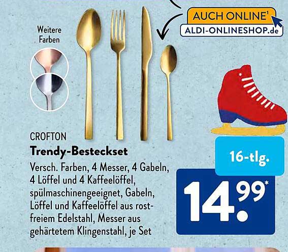 Entdecken Sie das großartige Crofton Trendy-Besteckset Angebot im neuesten Aldi Süd Prospekt. Neben diesem Angebot finden Sie noch viele weitere attraktive Rabatte. Sie können das Crofton Trendy-Besteckset einfach online über die Aldi Süd Website bestellen oder in einem Geschäft in Ihrer Nähe kaufen.