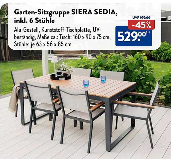 Sehen Sie sich jetzt das Garten-Sitzgruppe SIERRA SEDIA, inkl. 6 Stühle Angebot im Aldi Süd Prospekt an. Dieses Angebot ist gültig von 14.04.2025 bis 20.04.2025.