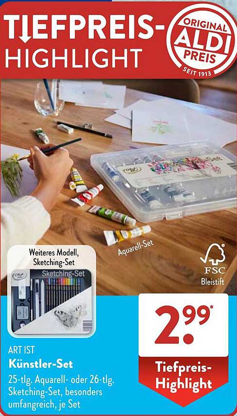 Entdecken Sie das großartige Künstler-Set Angebot im neuesten Aldi Süd Prospekt. Neben diesem Angebot finden Sie noch viele weitere attraktive Rabatte. Sie können das Künstler-Set einfach online über die Aldi Süd Website bestellen oder in einem Geschäft in Ihrer Nähe kaufen.