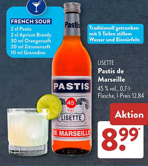 Sehen Sie sich jetzt das Lisette Pastis de Marseille 0,7 l Angebot im Aldi Süd Prospekt an. Dieses Angebot ist gültig von 23.06.2025 bis 28.06.2025.