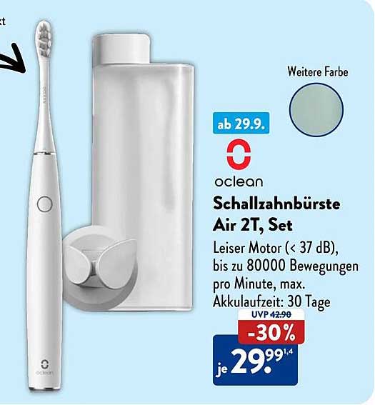 Sehen Sie sich jetzt das oclean Schallzahnbürste Air 2T, Set Angebot im Aldi Süd Prospekt an. Dieses Angebot ist gültig von 30.09.2024 bis 06.10.2024.