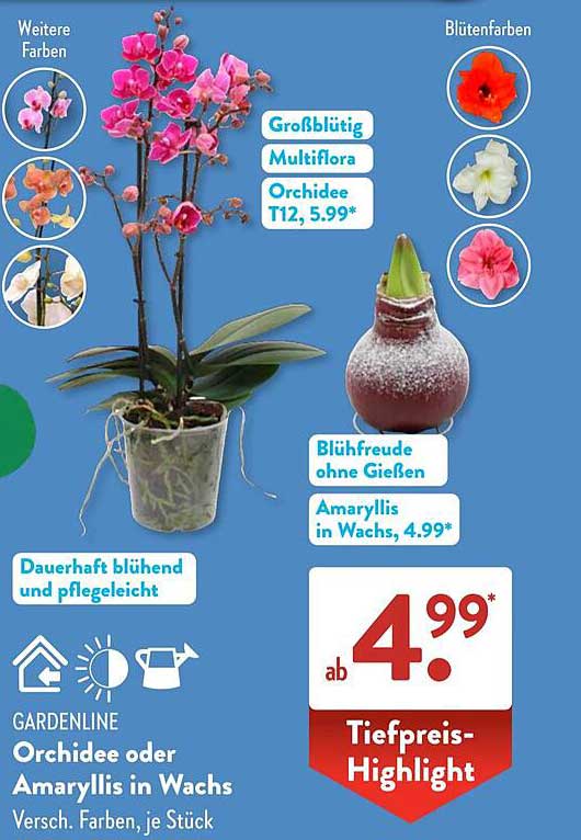 Sehen Sie sich jetzt das Orchidee oder Amaryllis in Wachs Angebot im Aldi Süd Prospekt an. Dieses Angebot ist gültig von 25.11.2024 bis 01.12.2024.
