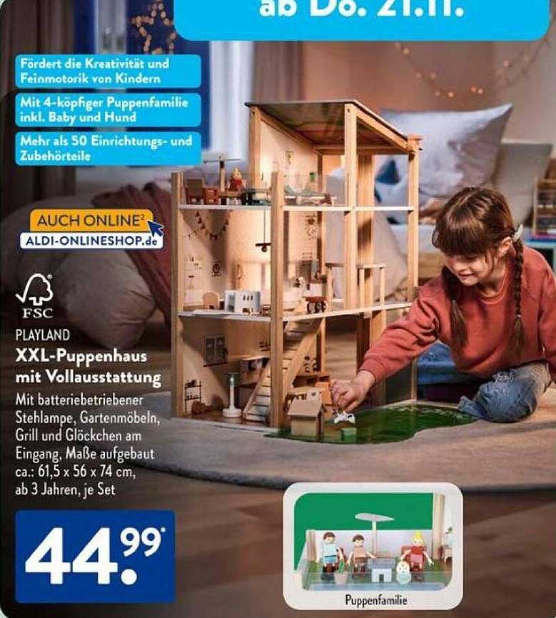 Sehen Sie sich jetzt das PLAYLAND XXL-Puppenhaus mit Vollausstattung Angebot im Aldi Süd Prospekt an. Dieses Angebot ist gültig von 18.11.2024 bis 23.11.2024.