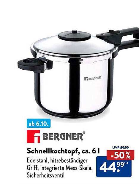 Sehen Sie sich das Schnellkochtopf, Ca. 6 L Angebot bei Aldi Süd an! Dieses fantastische Angebot ist jetzt im neuesten Aldi Süd Prospekt verfügbar. Nutzen Sie diese Chance und sparen Sie viel bei Ihrem Einkauf.