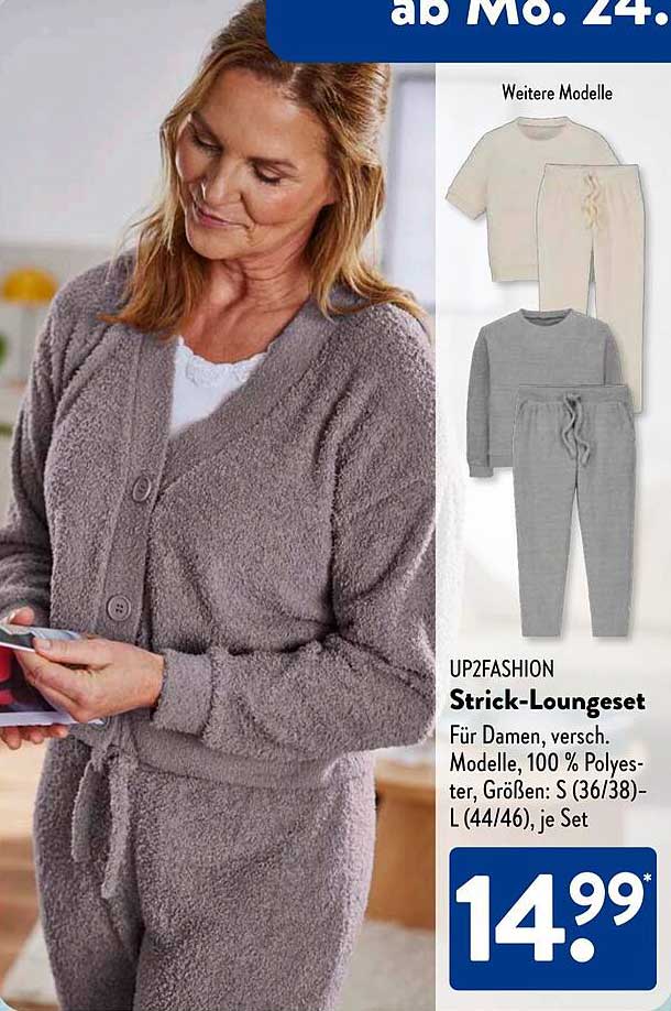 Sehen Sie sich das Up2Fashion Strick-Loungeset Angebot bei Aldi Süd an! Dieses fantastische Angebot ist jetzt im neuesten Aldi Süd Prospekt verfügbar. Nutzen Sie diese Chance und sparen Sie viel bei Ihrem Einkauf.