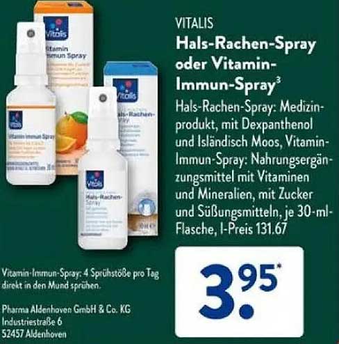Sehen Sie sich das Vitalis Hals-Rachen-Spray Oder Vitamin-Immun-Spray Angebot bei Aldi Süd an! Dieses fantastische Angebot ist jetzt im neuesten Aldi Süd Prospekt verfügbar. Nutzen Sie diese Chance und sparen Sie viel bei Ihrem Einkauf.