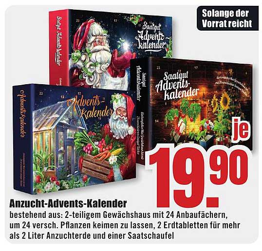 Sehen Sie sich jetzt das Anzucht-Advents-Kalender Angebot im B1 Discount Baumarkt Prospekt an. Dieses Angebot ist gültig von 06.10.2025 bis 11.10.2025.