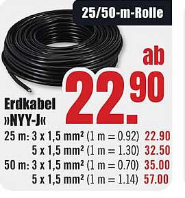 Sehen Sie sich jetzt das Erdkabel „NYY-J“ 25/50 m-Rolle Angebot im B1 Discount Baumarkt Prospekt an. Dieses Angebot ist gültig von 12.07.2025 bis 18.07.2025.