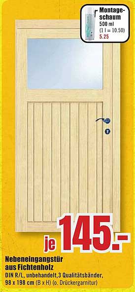 Sehen Sie sich jetzt das Nebeneingangstür aus Fichtenholz Angebot im B1 Discount Baumarkt Prospekt an. Dieses Angebot ist gültig von 25.10.2025 bis 31.10.2025.