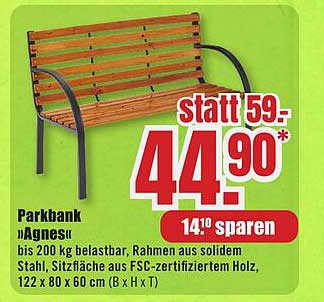 Sehen Sie sich jetzt das Parkbank »Agnes« Angebot im B1 Discount Baumarkt Prospekt an. Dieses Angebot ist gültig von 24.05.2025 bis 30.05.2025.