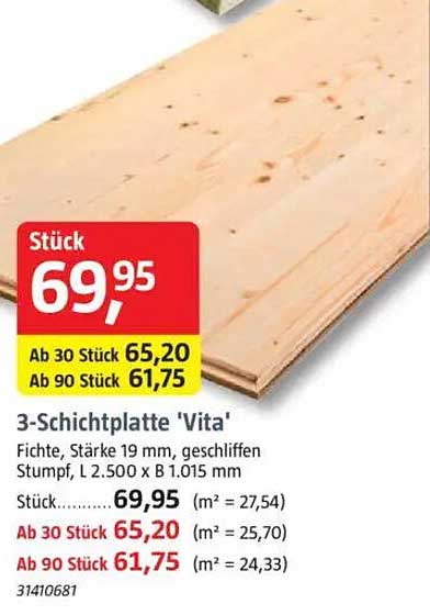 Die 3-Schichtplatte 'Vita' von Bauhaus ist die ideale Lösung für alle, die Wert auf Qualität und Vielseitigkeit legen. Mit einer Stärke von 19 mm und den Maßen L 2.500 x B 1.015 mm eignet sich diese Platte perfekt für eine Vielzahl von Bau- und Renovierungsprojekten. Ob im Innenausbau, Möbelbau oder zum Verkleiden, die 'Vita' überzeugt durch ihre ausgezeichnete Verarbeitung und ansprechende Optik.