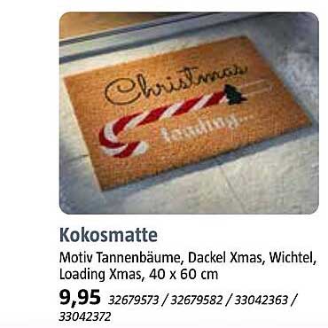 Sehen Sie sich jetzt das Kokosmatte Mit Motiv Tannenbäume, Dackel Xmas, Wichtel, Loading Xmas, 40 x 60 cm Angebot im Bauhaus Prospekt an. Dieses Angebot ist gültig von 01.11.2025 bis 29.11.2025.