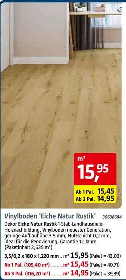 Sehen Sie sich jetzt das Vinylboden 'Eiche Natur Rustik' Angebot im Bauhaus Prospekt an. Dieses Angebot ist gültig von 29.03.2025 bis 03.05.2025.